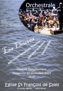 Pour ce concert l’Orchestrale vous propose de vous embarquer pour une aventure musicales, avec la Symphonie n°6 “Pastorale” de Beethoven, la nature n’y est pas peinte, elle y est ressentie : un ruisseau intérieur, un orage fugace, puis la gratitude apaisée. Smetana vous entraînera ensuite dans La Moldau (Vltava), poème symphonique qui suit le fleuve depuis ses deux sources jusqu’à Vyšehrad ; un thème voyageur se transforme au fil de noces paysannes, nuits lunaires et rapides. Et pour finir, le Beau Danube bleu de Johann Strauss II métamorphose le fleuve en cinq valses qui font de Vienne une cité légère, lumineuse et rêveuse, un bleu qui ravira vos oreilles. Un même fil conduira ce concert : nature grandiose, nation racontée, cité rêvée.